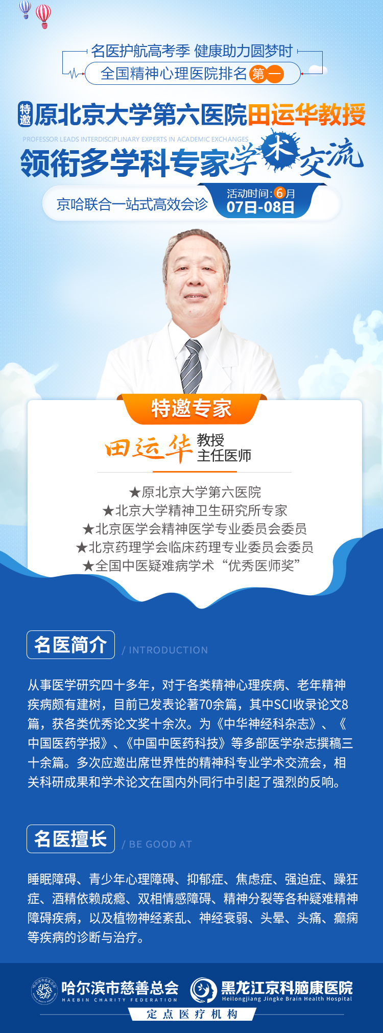 在孩子們經(jīng)歷高考這場身心巨變的關鍵時刻,6月7日-8日(僅兩天!),我們鄭重邀約原北京大學第六醫(yī)院精神科權威專家田運華教授親臨本院,開展特別會診活動。